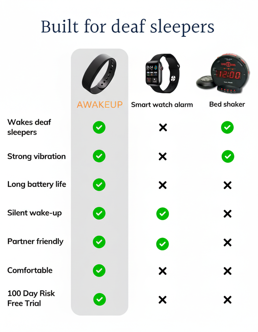 AWAKEUP uses direct wrist vibrations, a signal your brain responds to naturally — even when traditional sound alarms fail.
