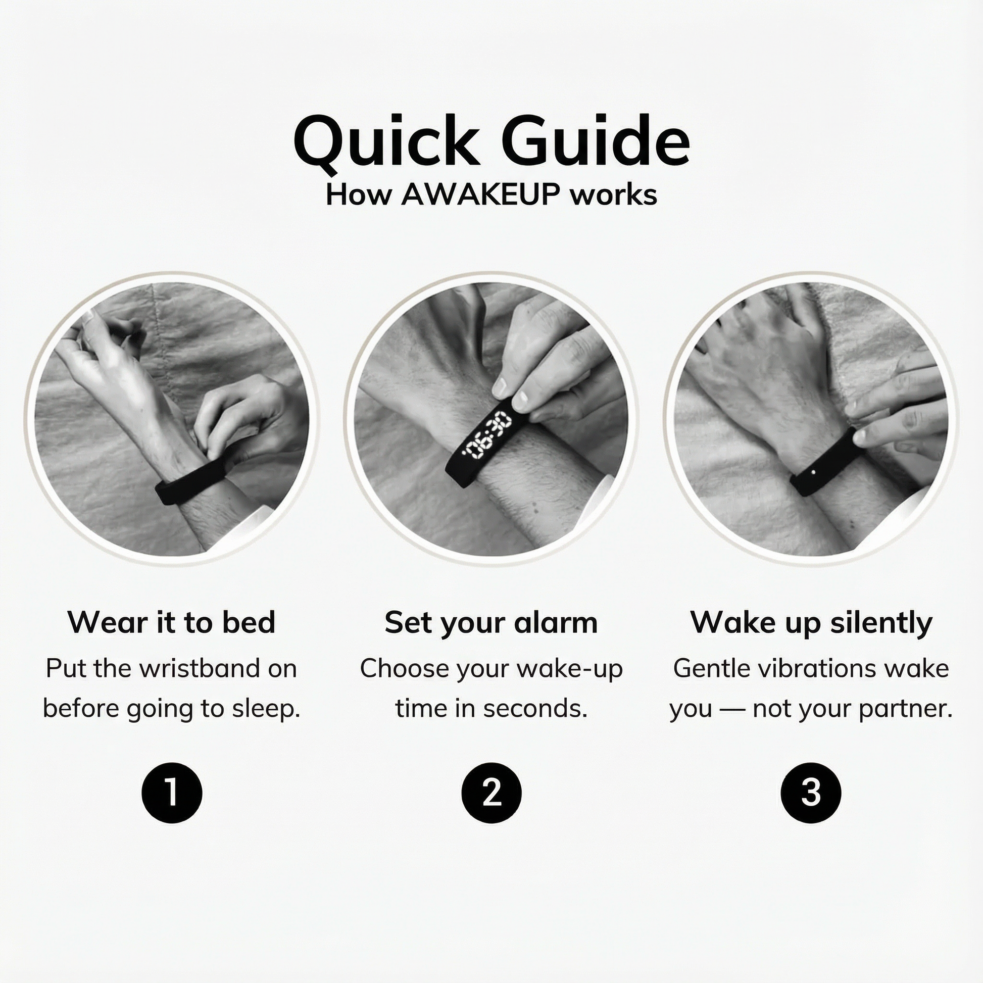 AWAKEUP is completely silent. Only you feel the vibration — no sound, no light, no disturbance.